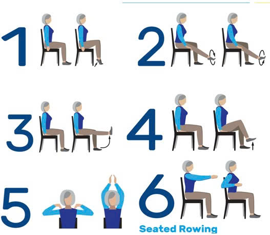 Hình: Một số ví dụ về các bài tập trong tư thế ngồi. Lặp lại 10 lần mỗi bài tập. Và lặp lại cả 2 bên.